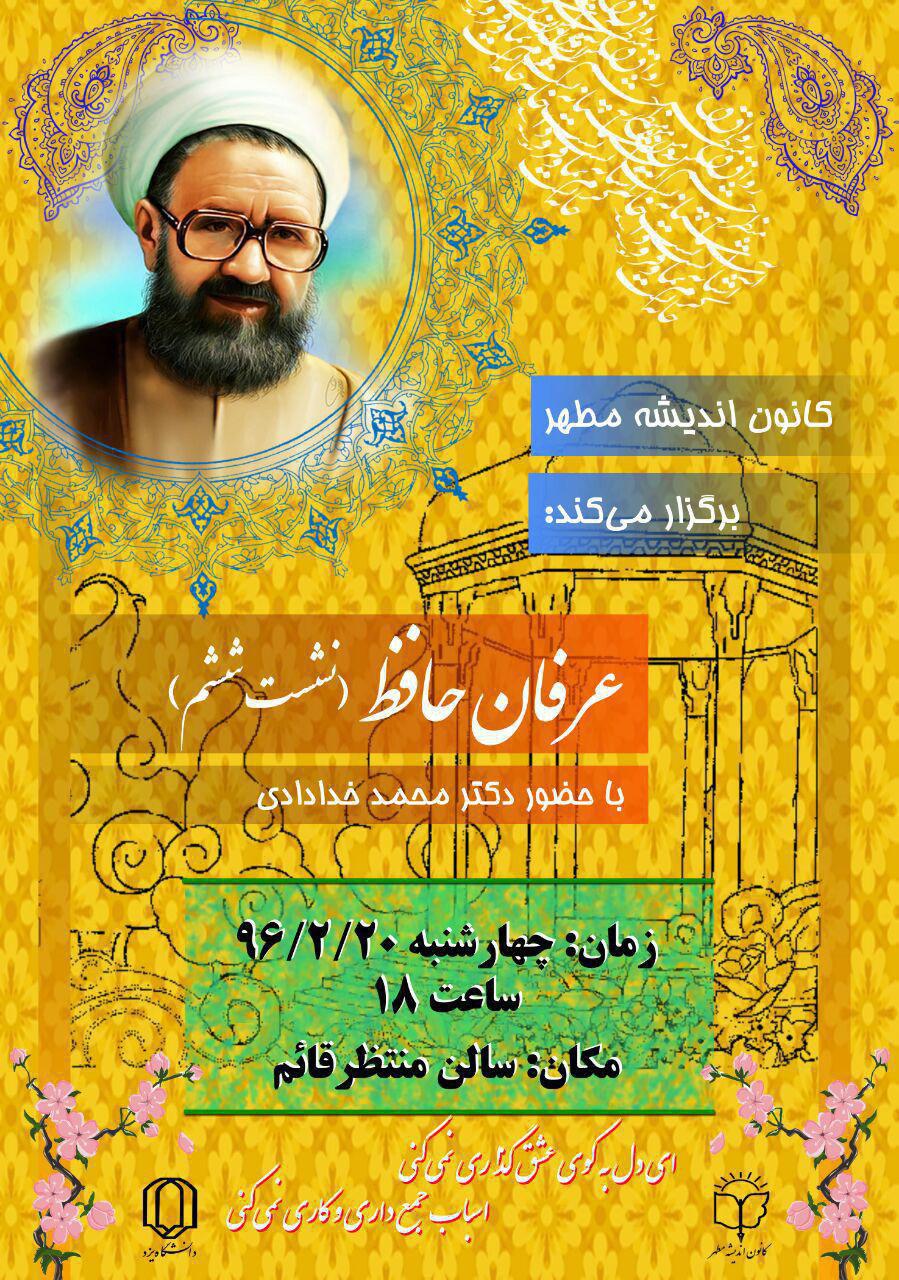 ششمین و آخرین نشست از سلسله جلسات عرفان حافظ عصر روز چهارشنبه، بیستم اردیبهشت هزار و سیصد و نود شش، با سخنرانی دکتر محمد خدادادی برگزار شد.